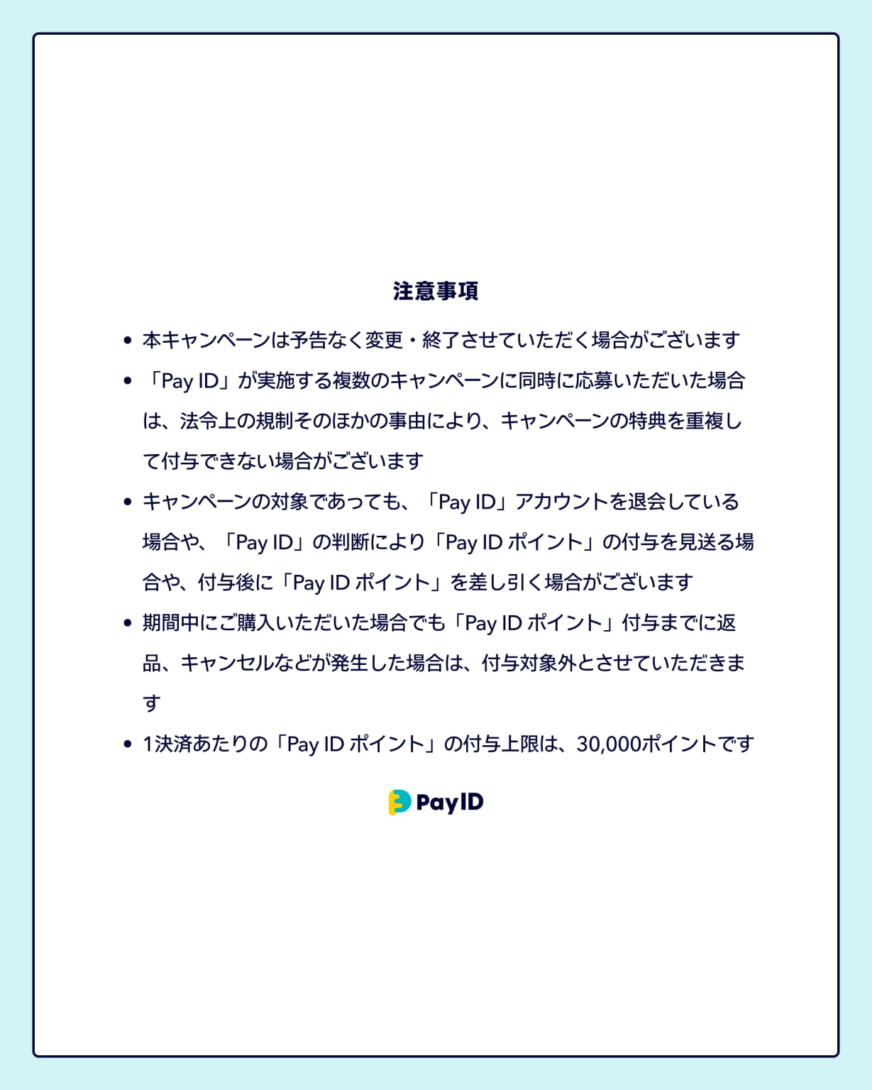 「Pay ID」が実施する複数のキャンペーンに同時に応募いただいた場合は、法令上の規制そのほかの事由により、キャンペーンの特典を重複して付与できない場合がございます